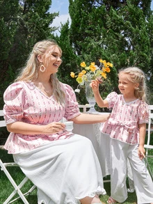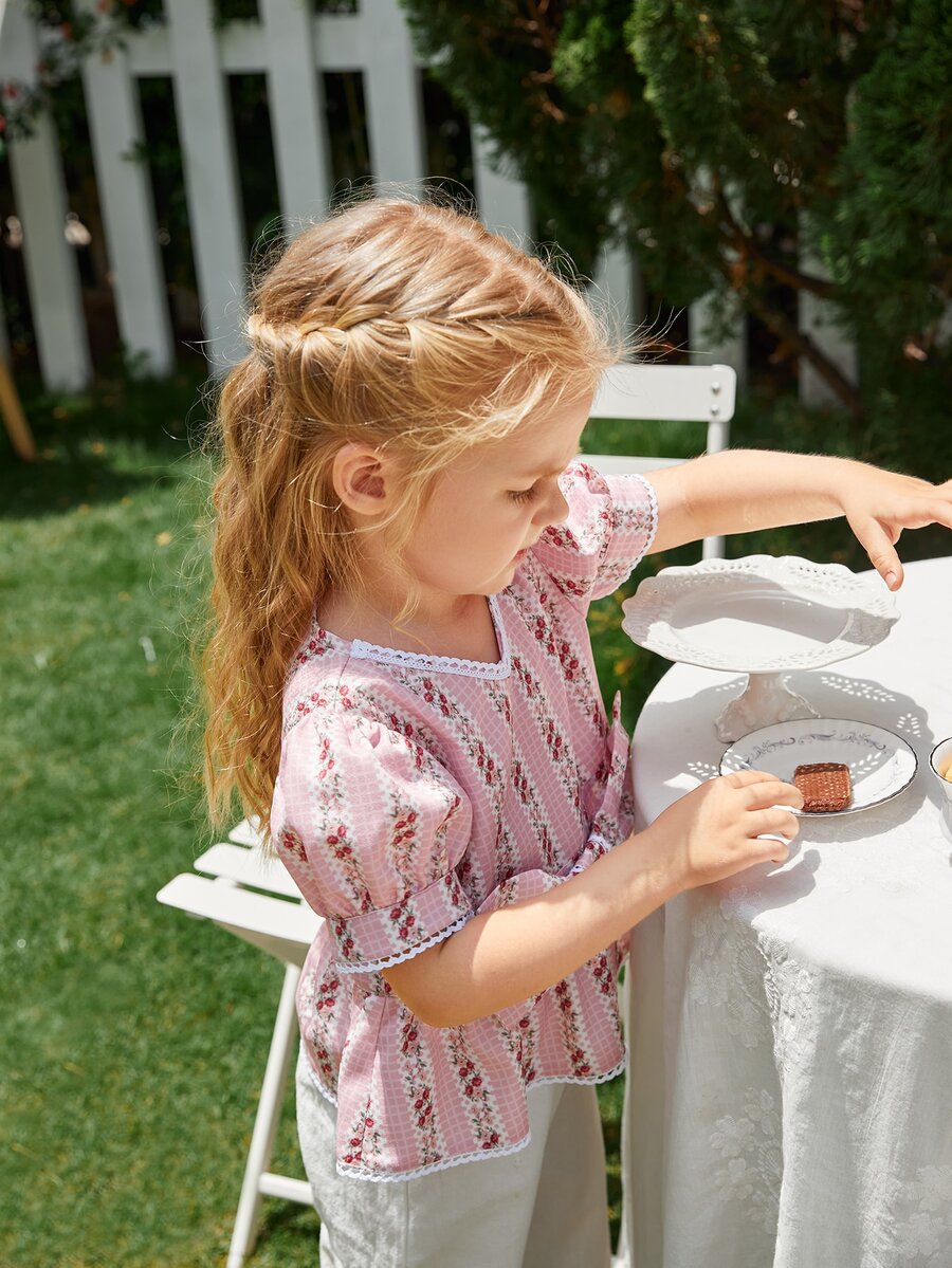 لباس علوي مربع النقش مزهر بحزام مقلم بدانتيل 1 قطعة للبنات الصغار