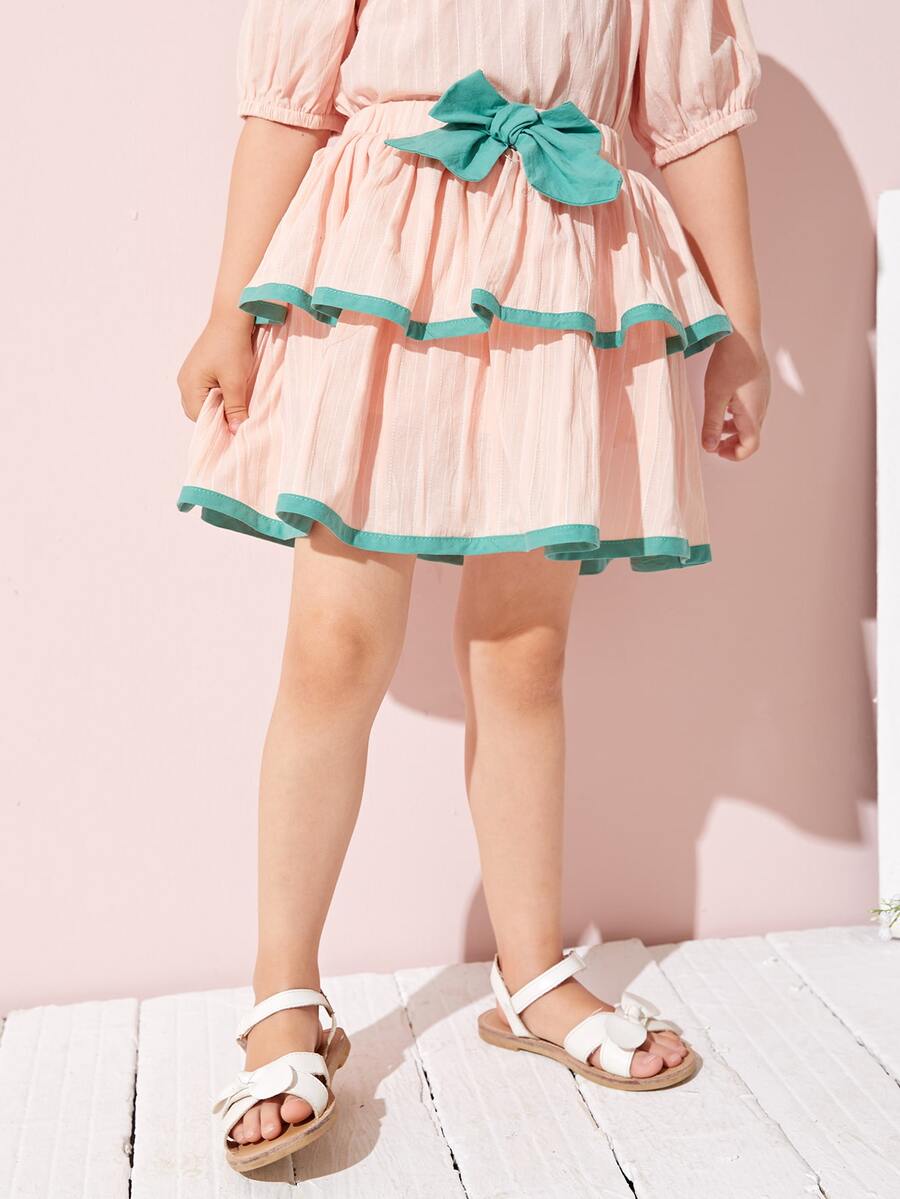 تنورة طبقات مقلم متباين بتفاصيل فيونكة للبنات الصغار