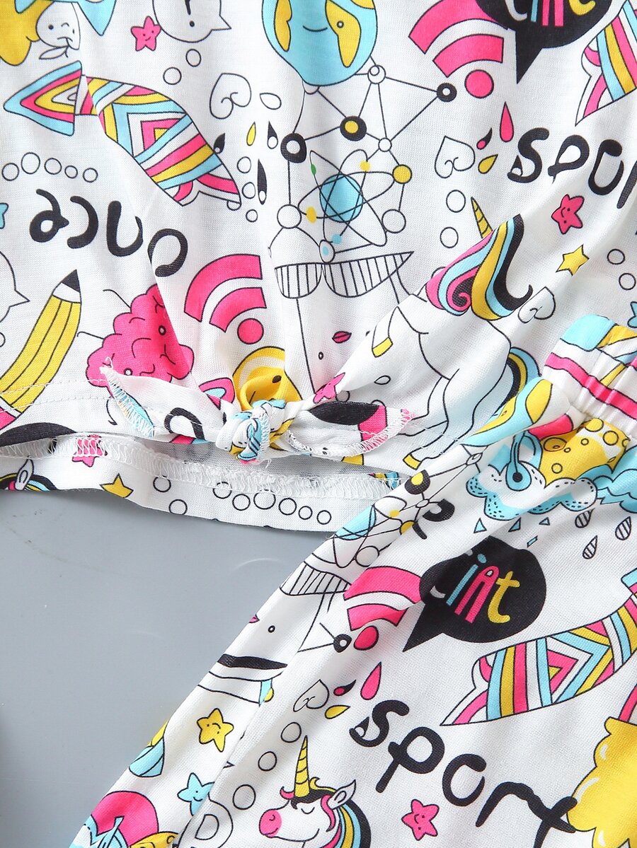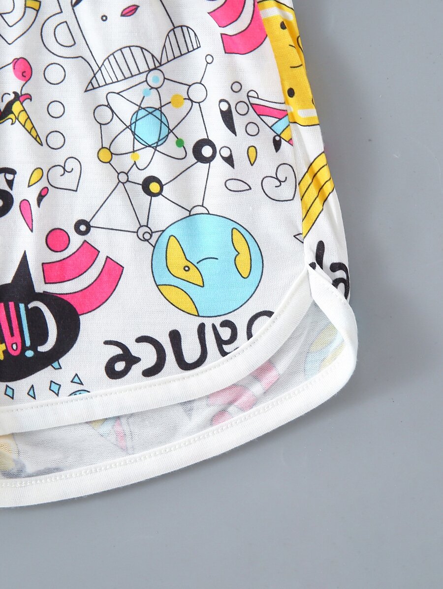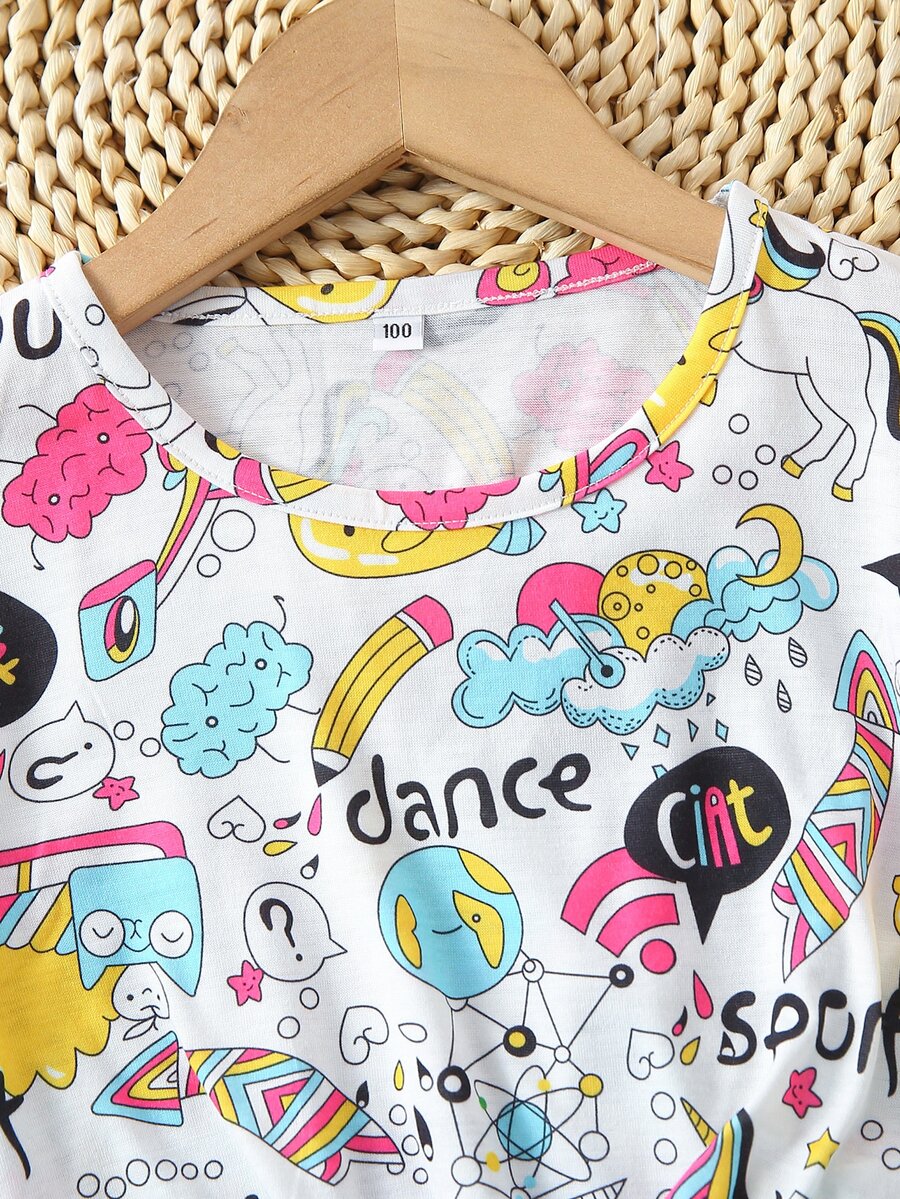 شورت مع تي شيرت بحافة معقود بجرافيك رسوم كارتون للبنات الصغار
