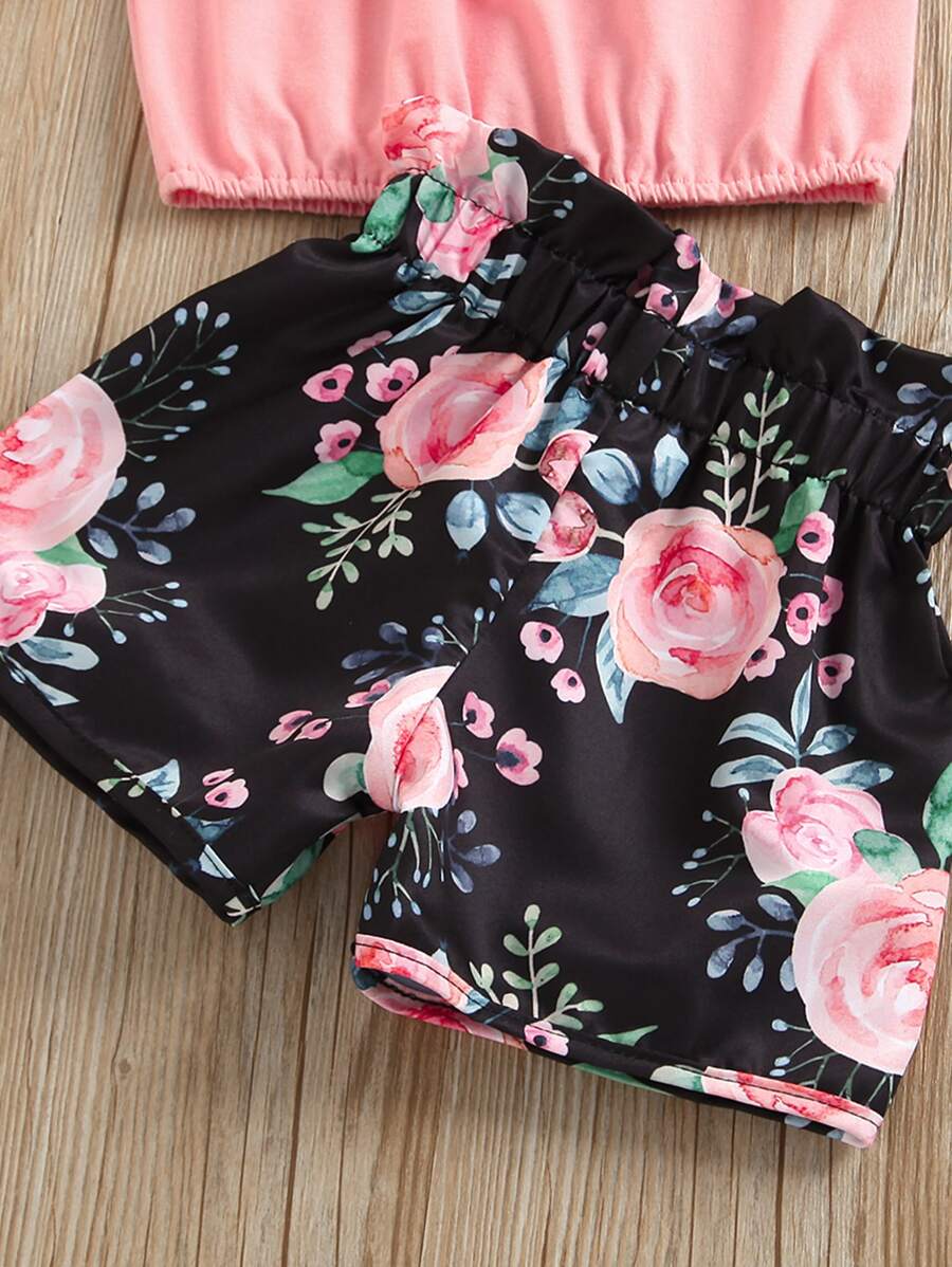 ملابس فتاة شابة شورت بطبعة الزهور وبلوزة بذراع مكشوف واكتاف باردة