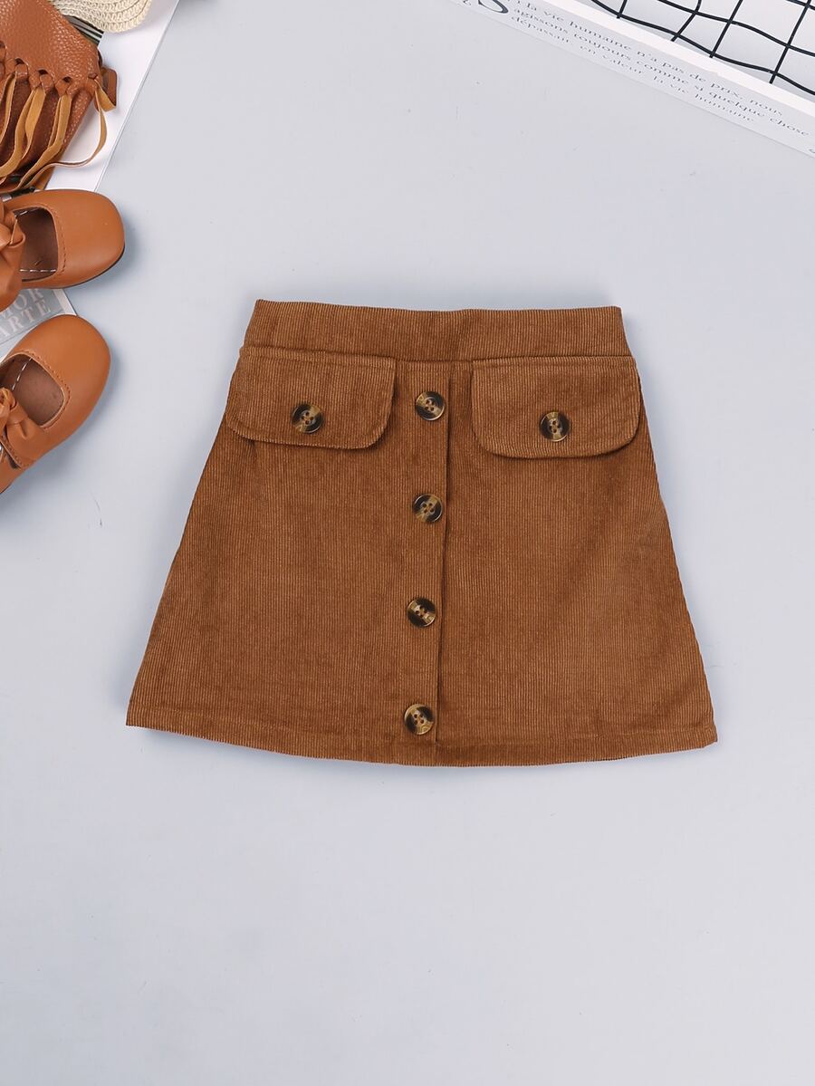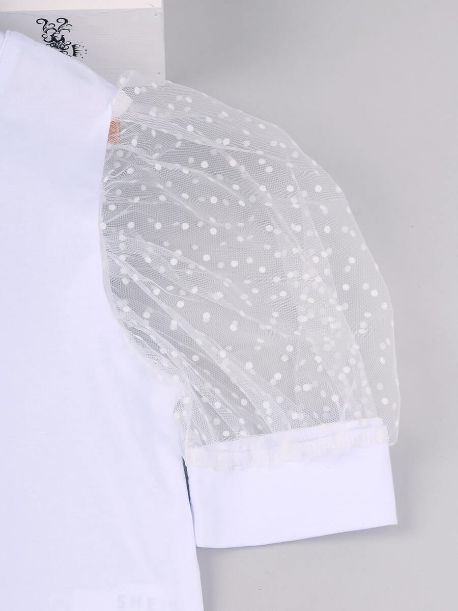 تنورة بأزرار امامي مع تي شيرت باكمام منفوخ شبكي متباين للبنات الصغار