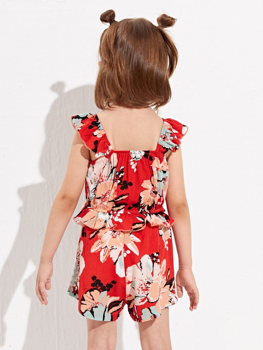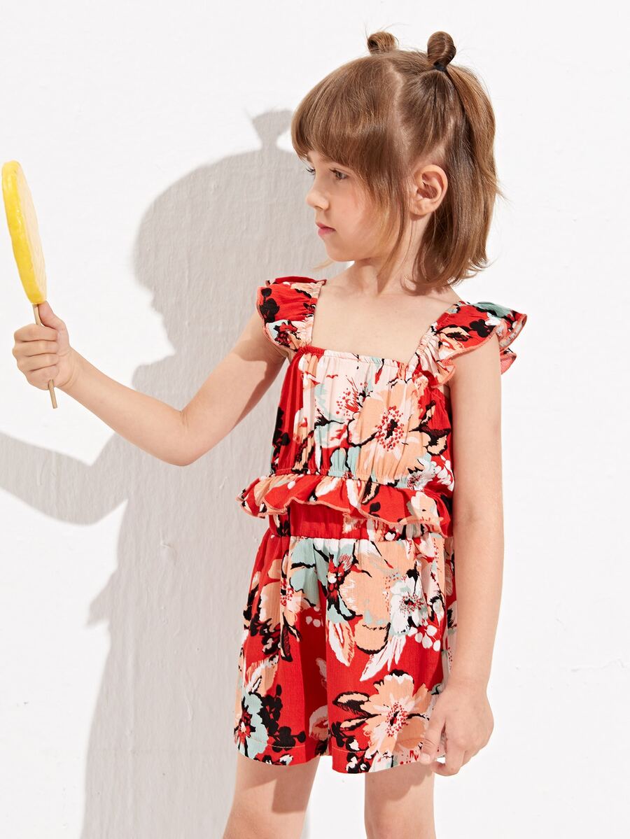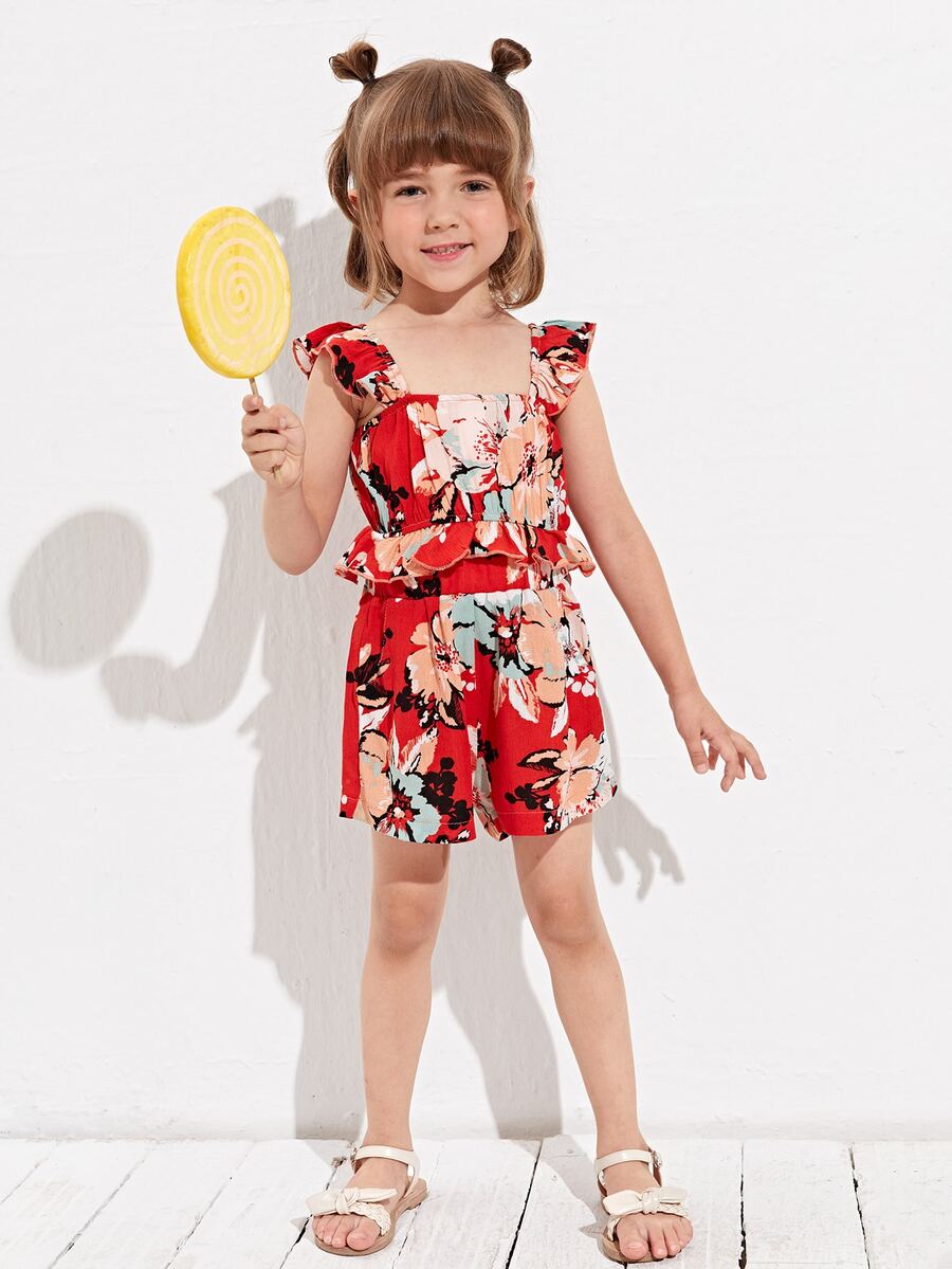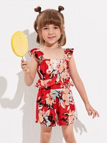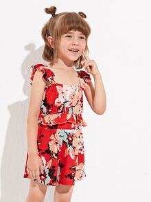 شورت مع لباس علوي كامي مقلم مكشكش بطباعة أزهار للبنات الصغار