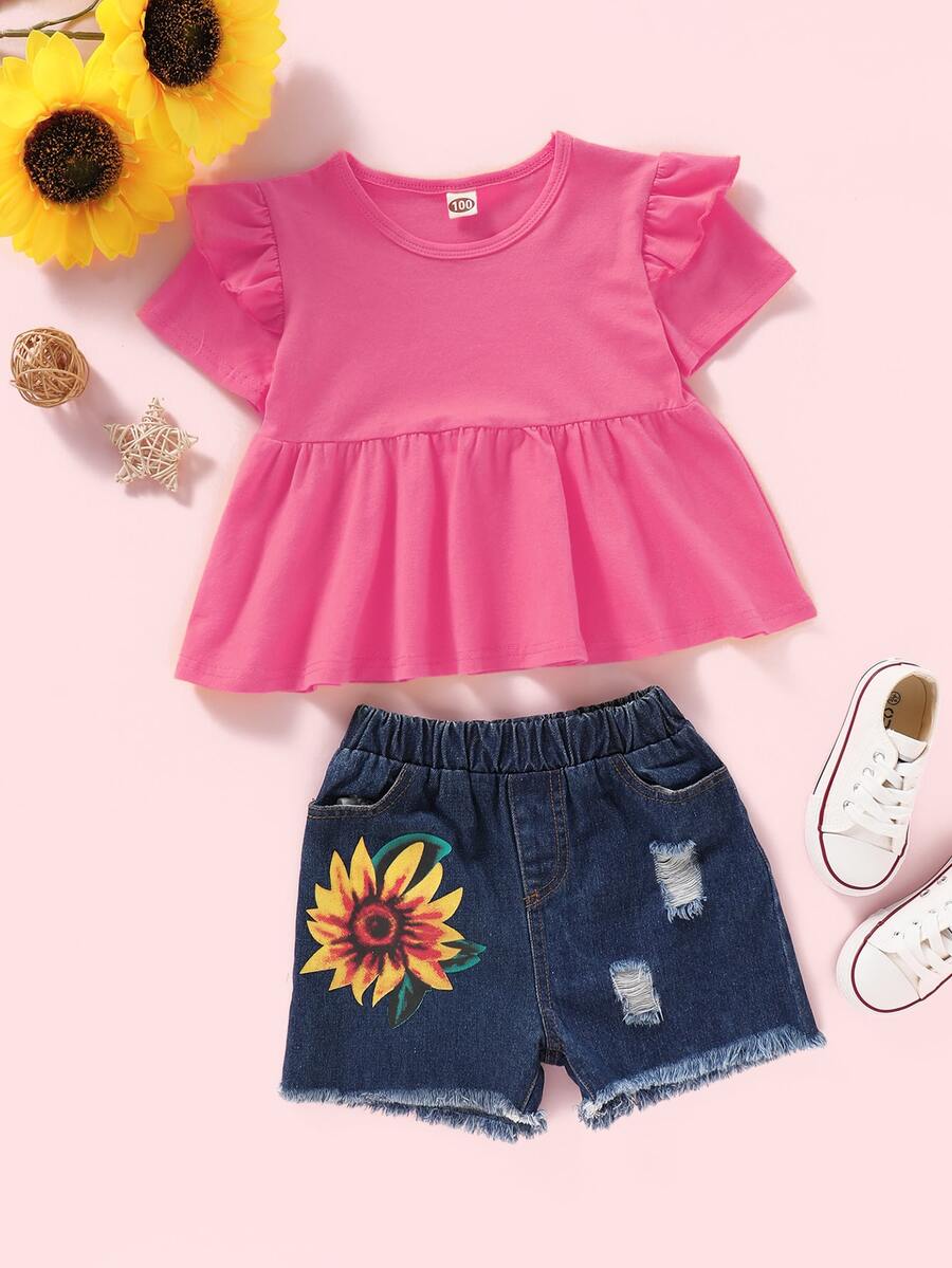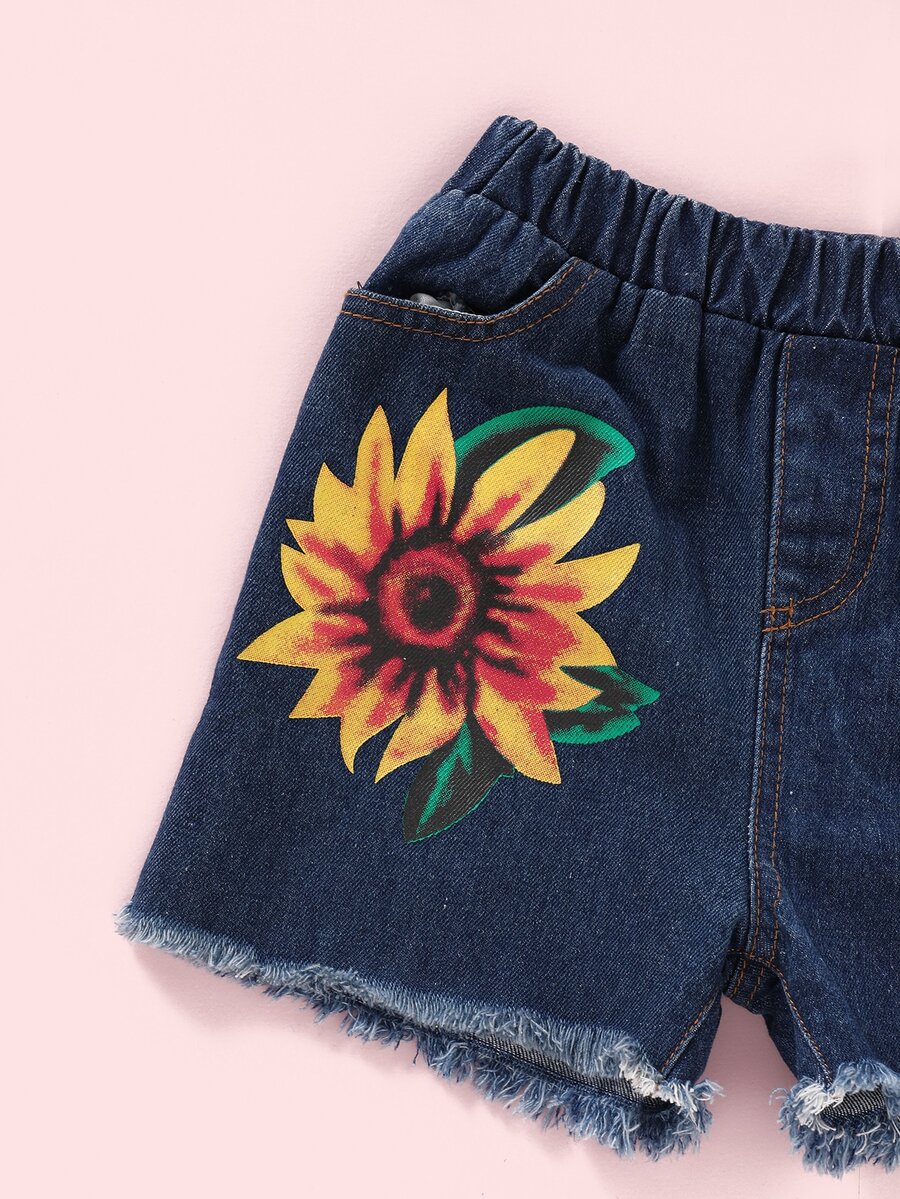 للبنات الصغار موحدة اللون تي شيرت بيبي دول مع طباعة عباد الشمس شورت دنيم