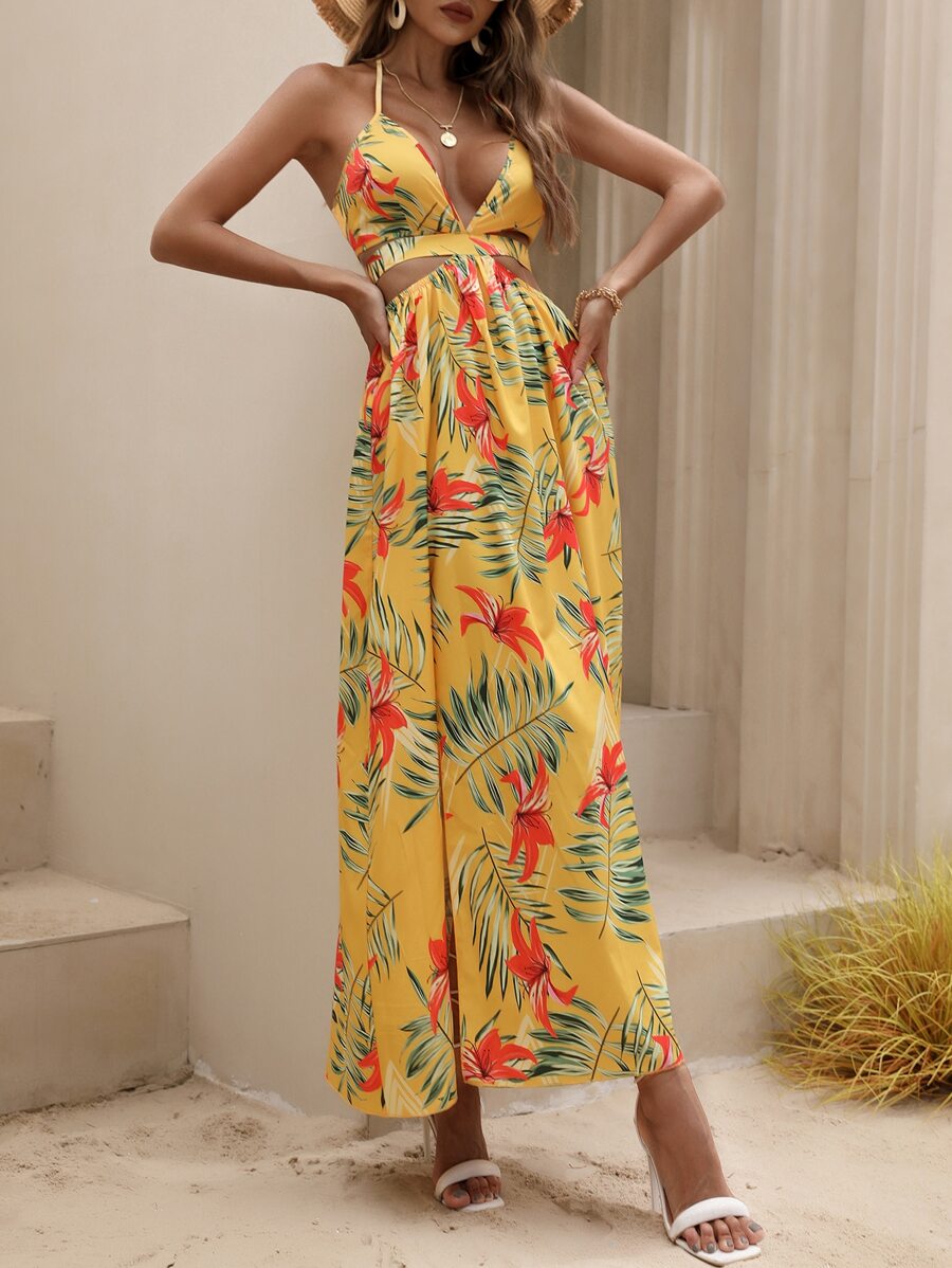 فستان ماكسي طبعات استوائية، بلا ظهر، عنق مستدير مربوط، بشق على مستوي الفخذ للنساء، ملابس شاطئ للعطلة