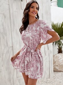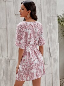 فستان بحزام بأكمام بتلة بطباعة استوائي