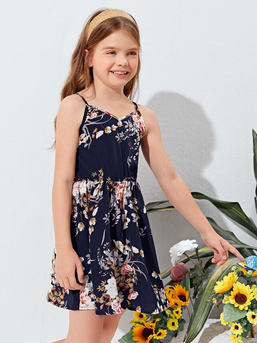 فستان كامي بطباعة زهر وبخصر عالي للبنات