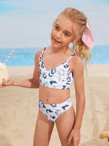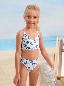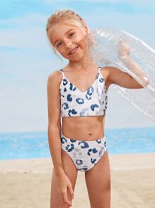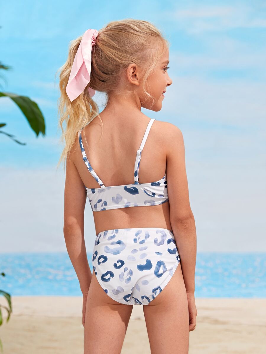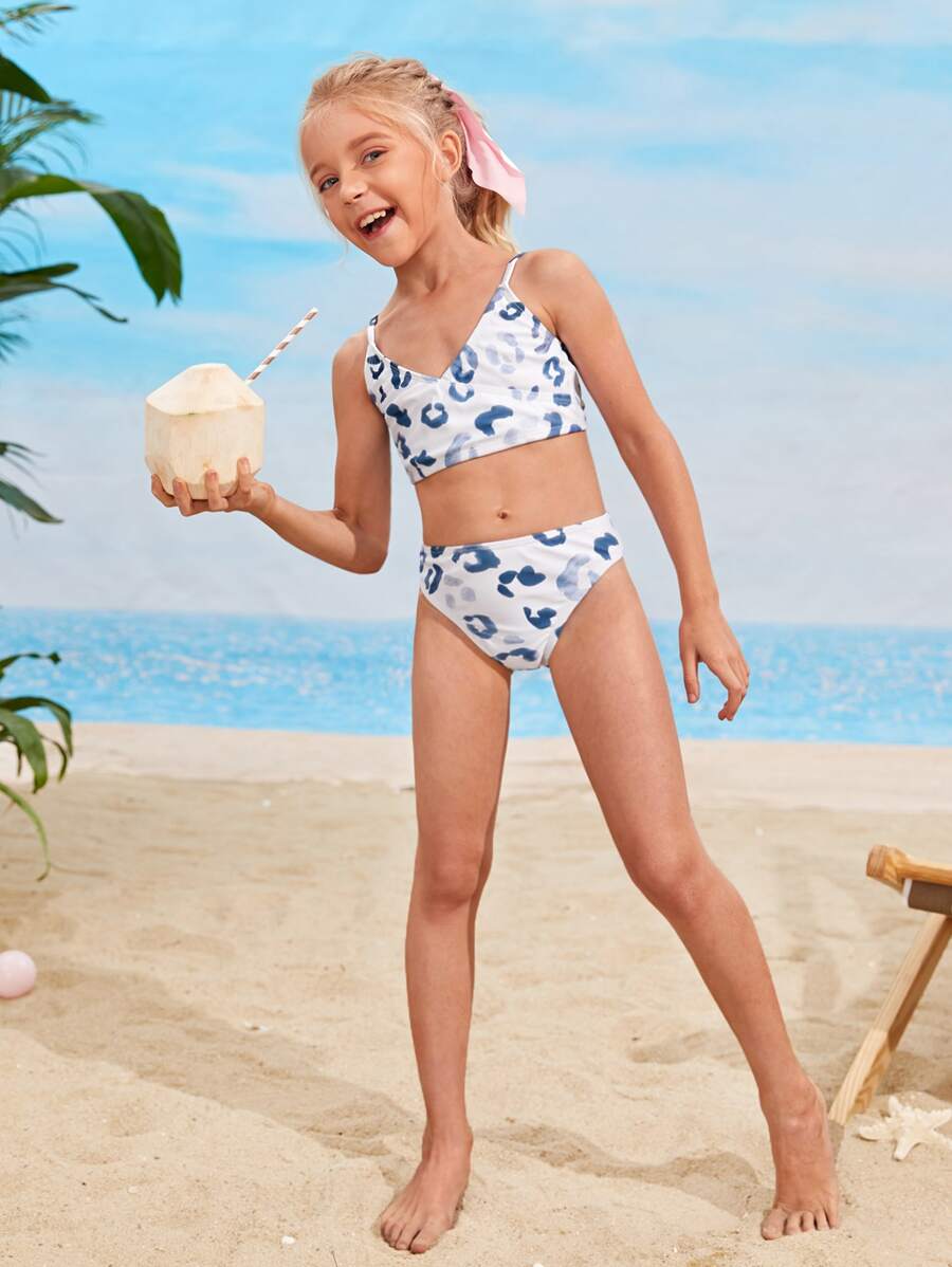 طقم بكيني بياقة فائقة بطبعة نمر للفتيات الناشئات للشاطئ الصيفي