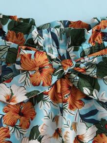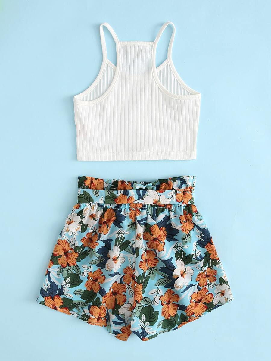 طقم سروال قصير مزهر بحزام وبخصر مكشكش ورقي مع لباس علوي مقصوص بحمالات محبوك ومضلع للبنات