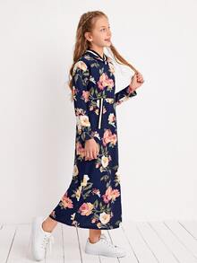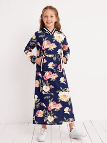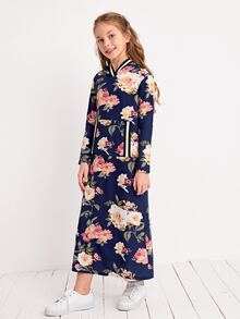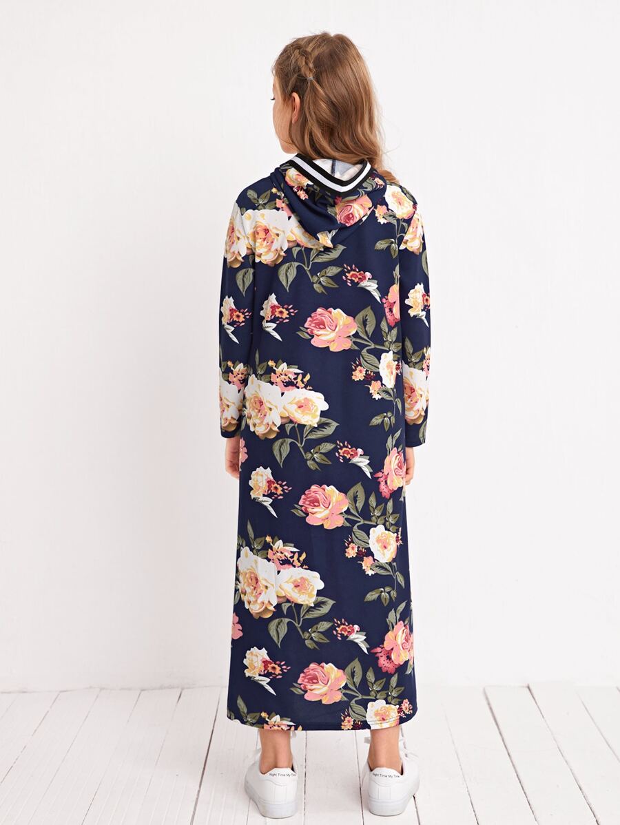 فتاة مراهقة مزينة بنطاق شريط مخطط وزهور تغطي الفستان بالكامل ومزودة بغطاء للرأس