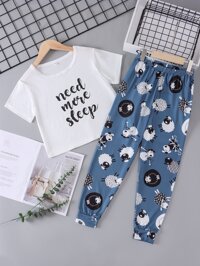 مجموعة بيجاما مطبوعة بخروف كرتوني، تشمل القميص والسراويل