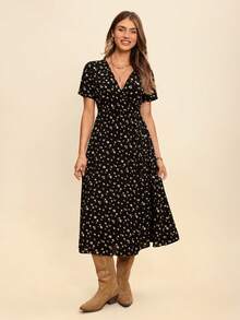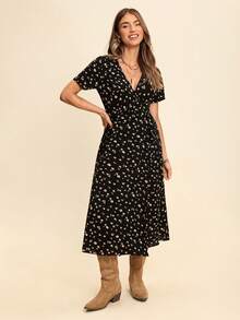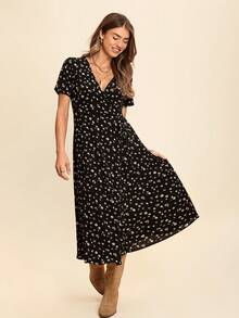 فستان مطوي معقود جانبي مزهر وبعنق V