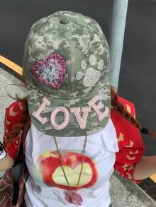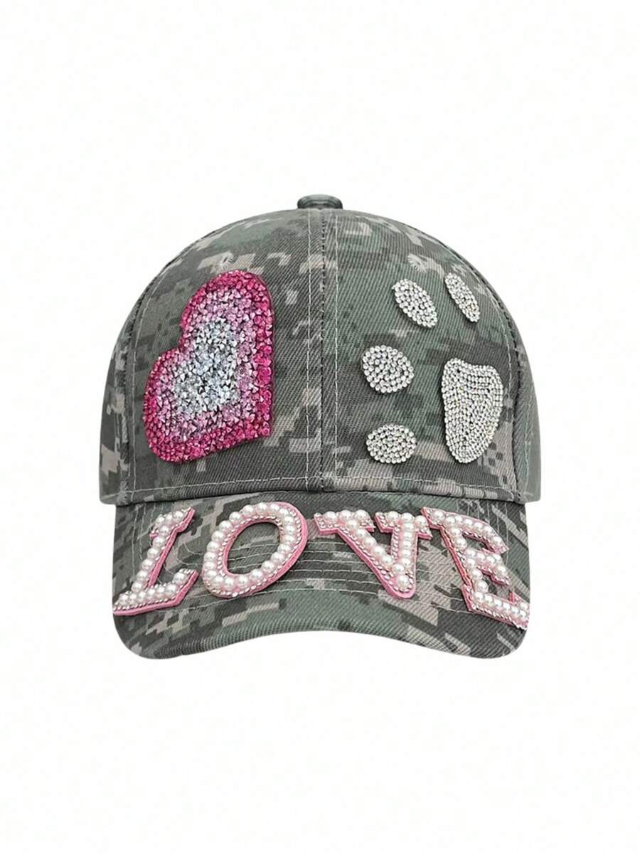 Grunge Punk قبعة بيسبول مفصلة من القطيفة المموهة اللامعة بشارة قلب ذو بصمة كلب صغير وخرزات لؤلؤية، قبعة أب عتيقة ذات طابع y2k عصري، قبعة شمس مرنة مناسبة للحفلات والتجمعات الاجتماعية والعطلات