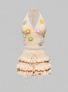طقم كنزة صوفية نسائية ذات ياقة حلقية مطوية بطبعات زهرية عتيقة، للصيف والعطلات