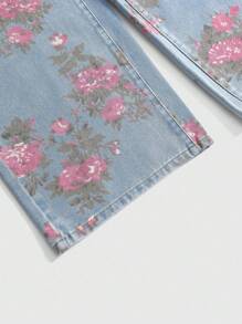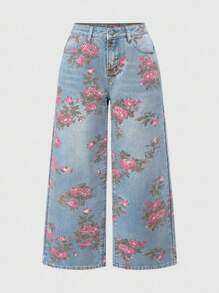 Fairycore بنطلون جينز فضفاضة واسعة الساق للنساء ذوات الحجم الكبير مع طباعة زهرية