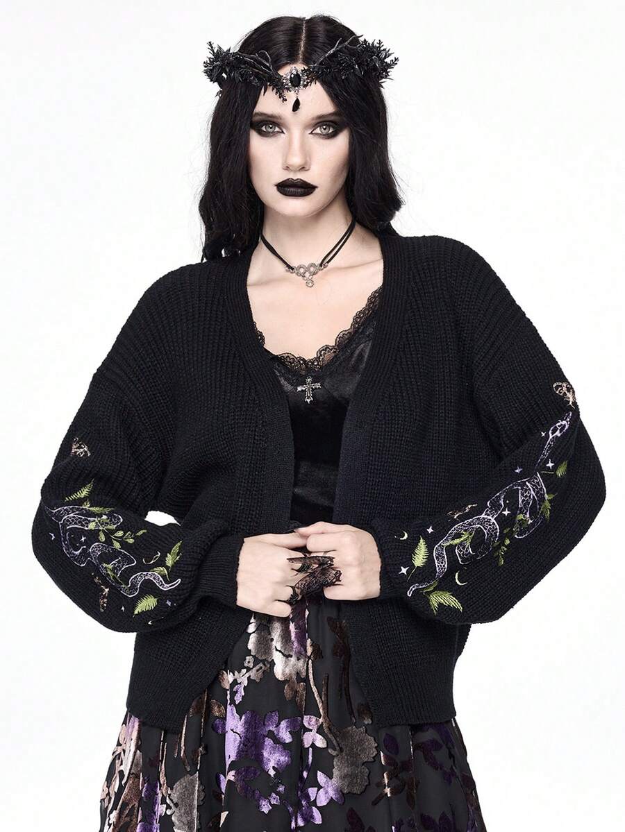 Goth كارديجان أنيق مطرز بالثعبان للنساء، بياقة على شكل حرف V وأكمام فانوس فضفاضة، جاكيت كاجوال للخريف