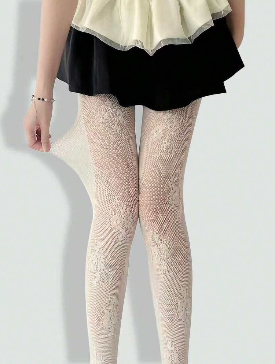 Kawaii جوارب شبكية عالية المرونة بطبعات زهرية بيضاء