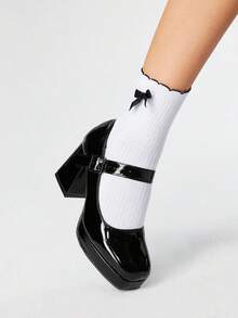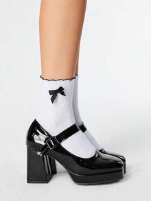 Kawaii أحذية نساء ذات كعب عالي أسود، إصبع القدم مغلق، بمشبك ماري جاين مع سكّة أمامية، بتصميم فيونكة غوثية لوليتا، طراز جوارب مدرسية حلو للسيدات