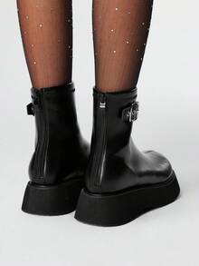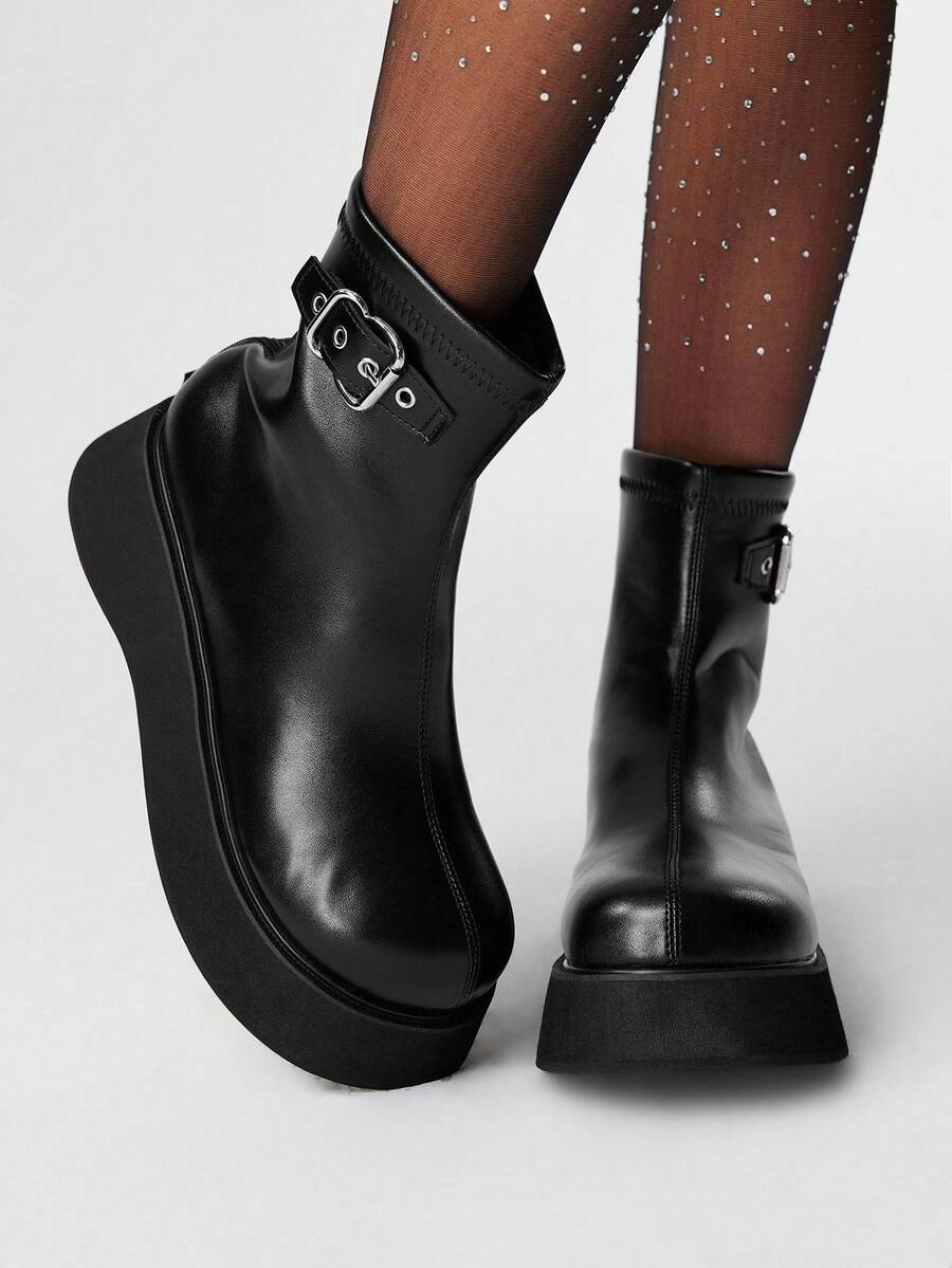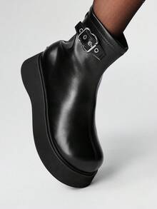 Grunge Punk بوت الكاحل تشيلسي كاجوال للنساء ذات الكعب السميك، رأس مستدير مع إبزيم معدني وسحاب خلفي، ارتفاع الكعب 2 بوصة، بوت بلاتفورم من الجلد بطراز بريطاني بانك، بوت للخروج والتنقل اليومي