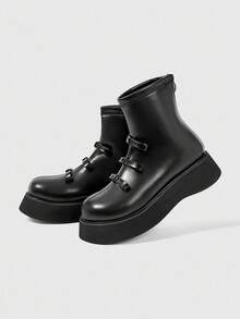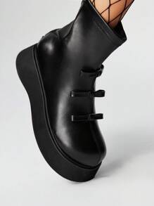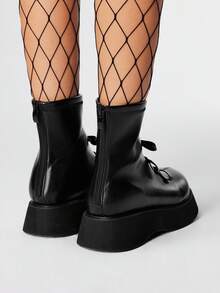 Grunge Punk بوت الكاحل تشيلسي الكاجوال للنساء ذات الكعب السميك، برقبة مدورة مزينة بفيونكة، سحاب خلفي، كعب سميك 2 بوصة، بوت بلاتفورم جلدية بطراز بريطاني بانك، بوت للخروج والتنقل