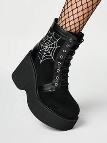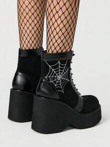 Grunge Punk بوت قصيرة بكعب سميك للنساء، بطراز بانك جوثي مطرز بنسيج العنكبوت، بأربطة وسحاب خلفي، بوت الكاحل ذات الكعب العالي والمنصة السوداء بطراز الدراجات النارية