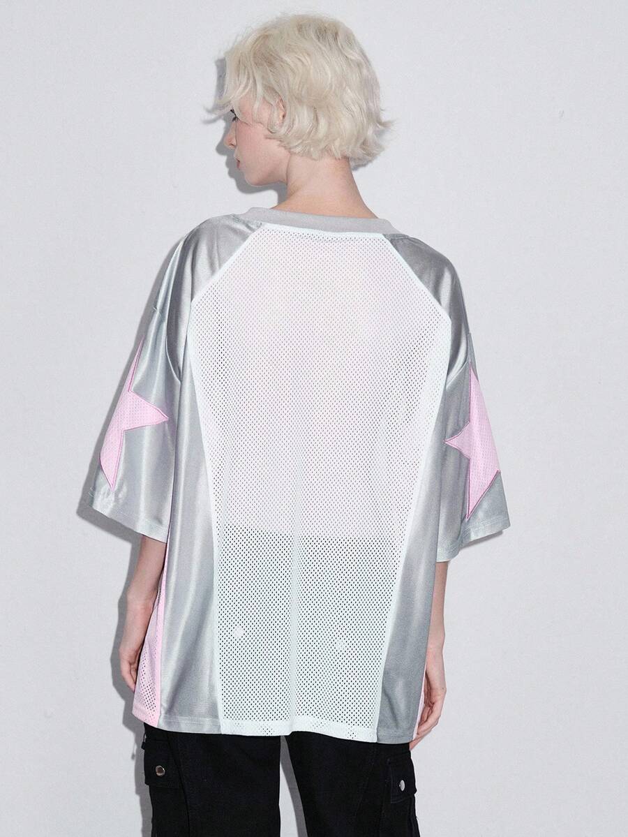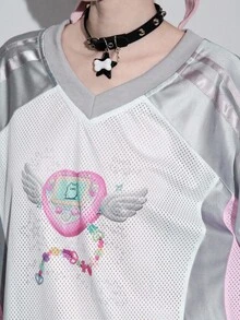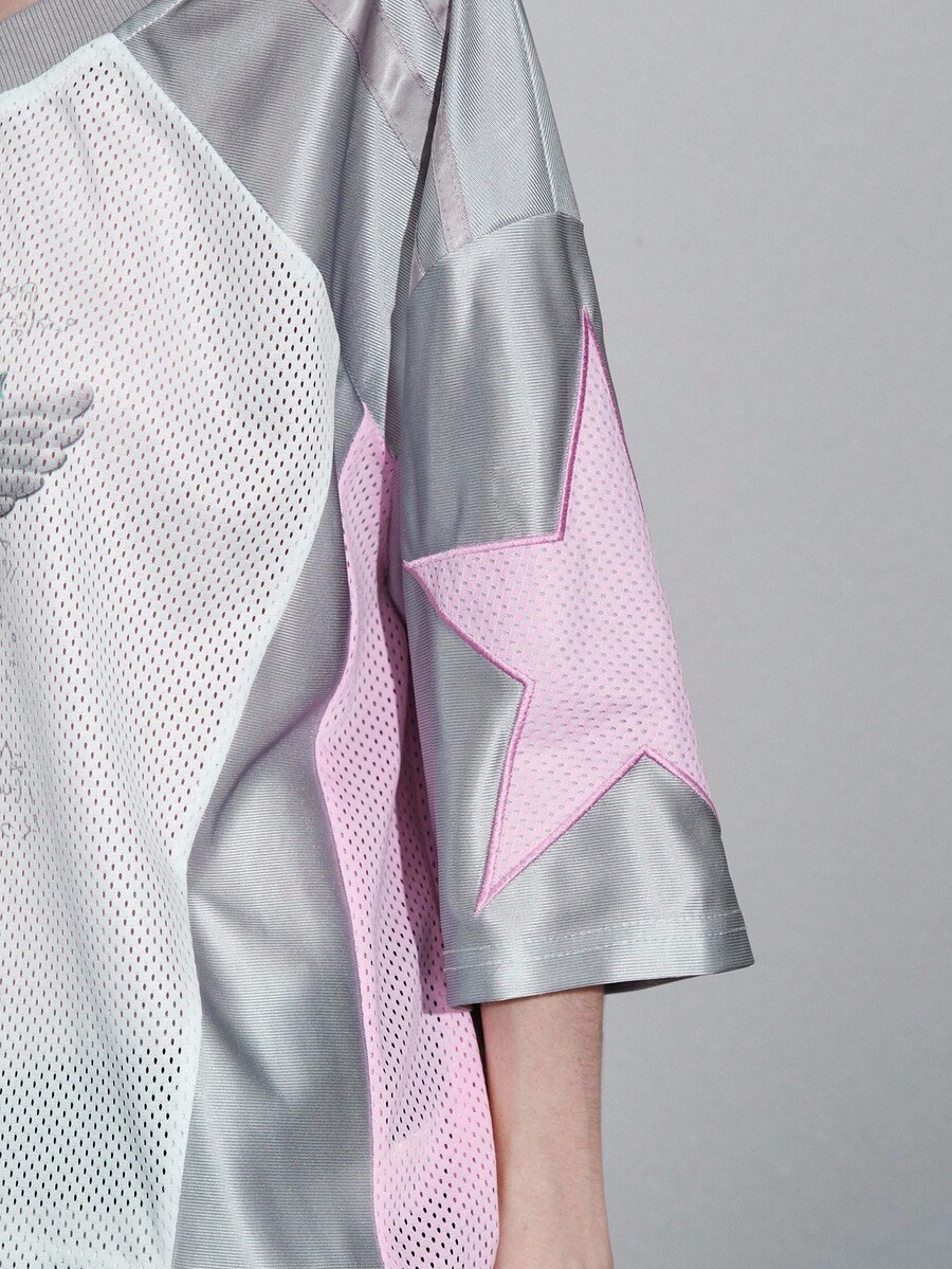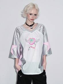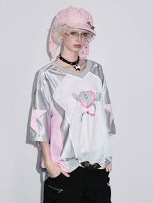 ROMWE Avant تي شيرت كاجوال فضفاض للنساء بياقة على شكل حرف V وتطريز نجمة