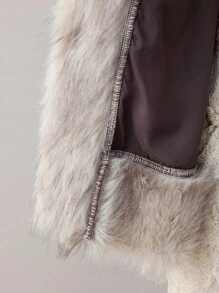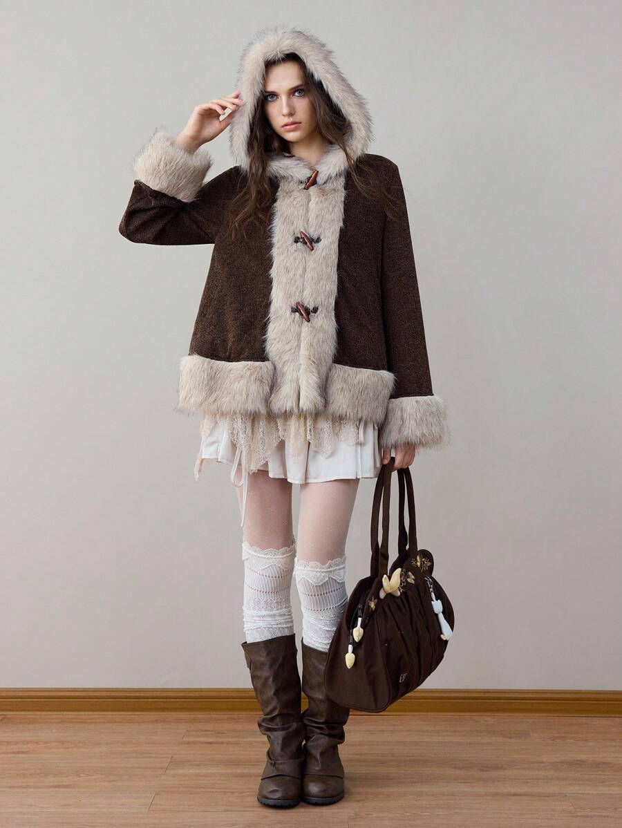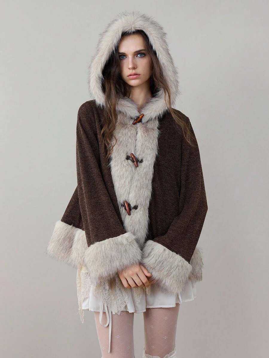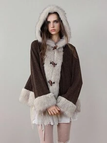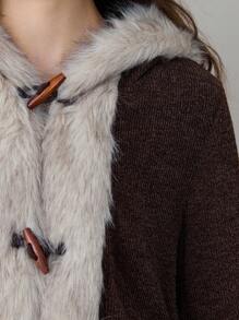 ROMWE Avant معطف كارديجان مقلم بألوان متباينة مزود بقلنسوة من الفرو الصناعي طويل الأكمام للنساء