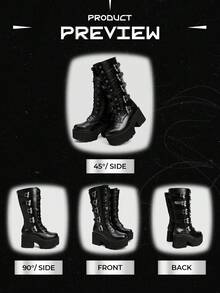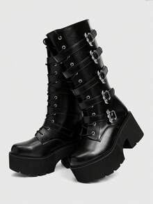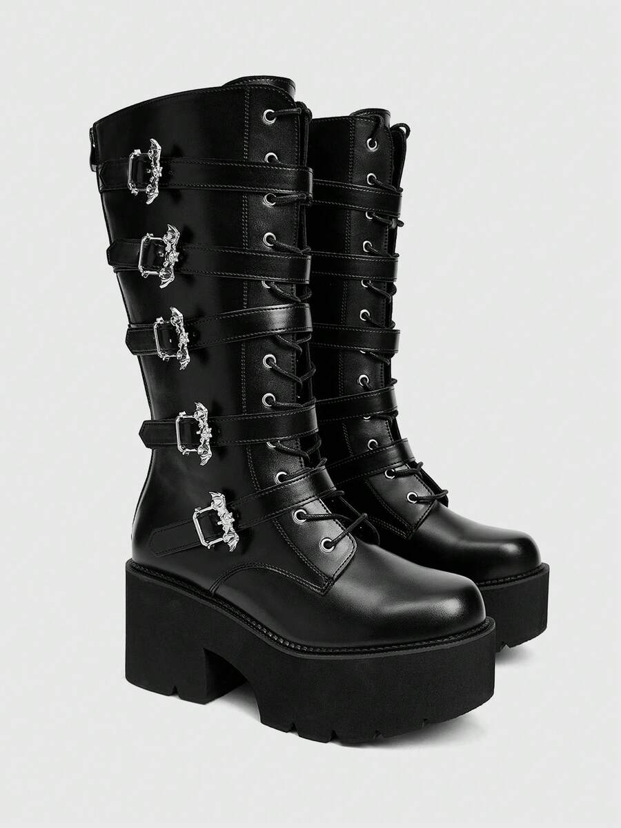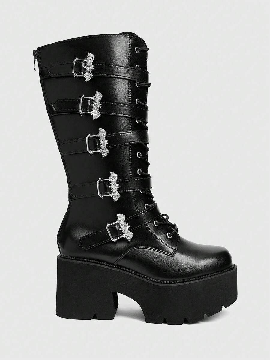 Grunge Punk بوت نسائية بنمط بانك ذات كعب سميك وقاعدة مرتفعة حتى الركبة، سوداء مزينة بإبزيم معدني بتصميم خفاش، بوت ركبة مريحة بطراز فارس، مناسبة لمناسبة هالوين
