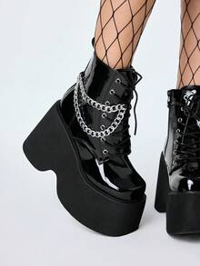 Goth بوت قصيرة نسائية بنمط بانك Y2K ذات كعب سميك ومنصة، مزودة بسلاسل معدنية وسحاب جانبي، مناسبة للأداء على المسرح