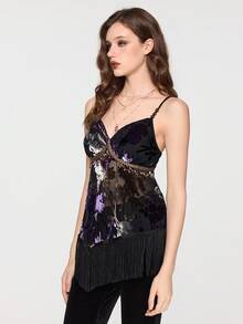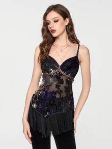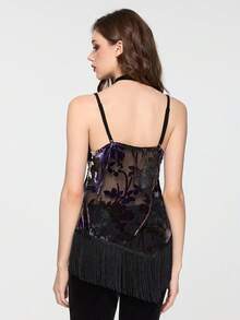 Hippie ملابس علوية ملابس علوية بدون أكمام من المخمل المحروق بتصميم غامض على طراز الساحرة الهيبي الرجعي، مزين بسلسلة من الخرز والشراريب غير متماثلة