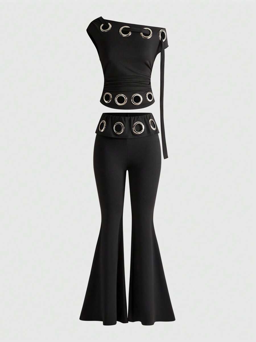 ROMWE Avant بنطلون بقصة واسعة للساق وكتف مفتوح مع تفاصيل دانتيل مجموعة قطعتين بطراز رجعي وإغراء