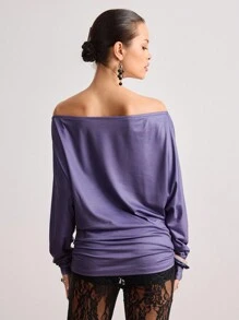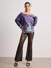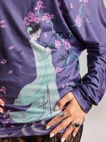 ROMWE Avant تي شيرت نسائي فضفاض بطبعة زهرية من الرسم الصيني القديم بالكتف المكشوف