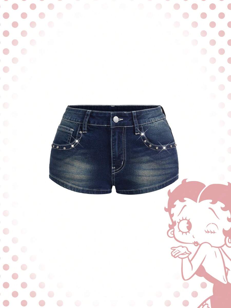 Betty Boop | ROMWE شورتات جينز منخفضة الخصر بطراز بانك فينتاج Y2K مطرزة بالمسدس