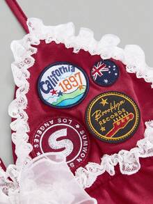 ROMWE Avant قميص كامي بتصميم رقبة حلقة مزين بالتطريز والدانتيل الأنيق بطراز رياضي بالي عصري للنساء