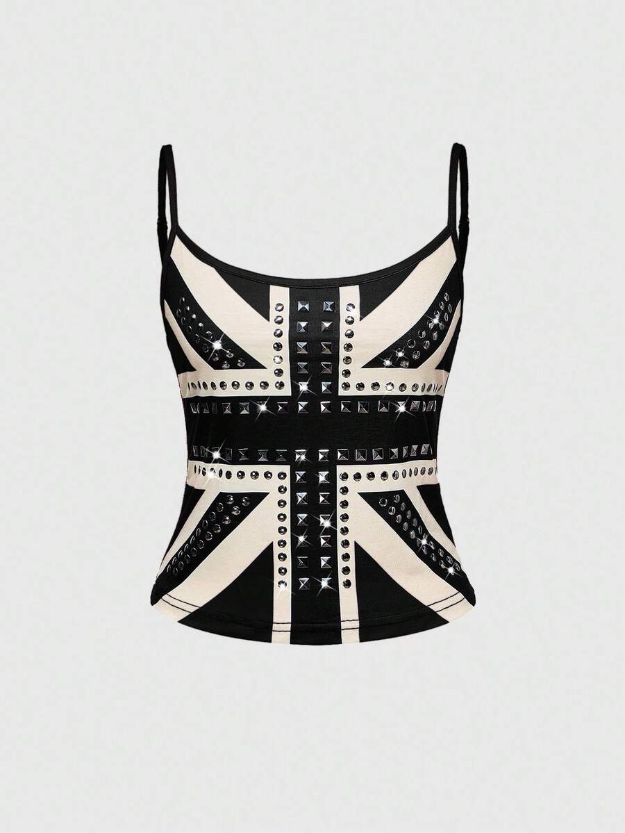 Grunge Punk ملابس علوية كاميسول مطبوعة بعلم المملكة المتحدة مرصعة بالراين والنيتات، طراز كوري كي بوب وعصر الألفية الثانية