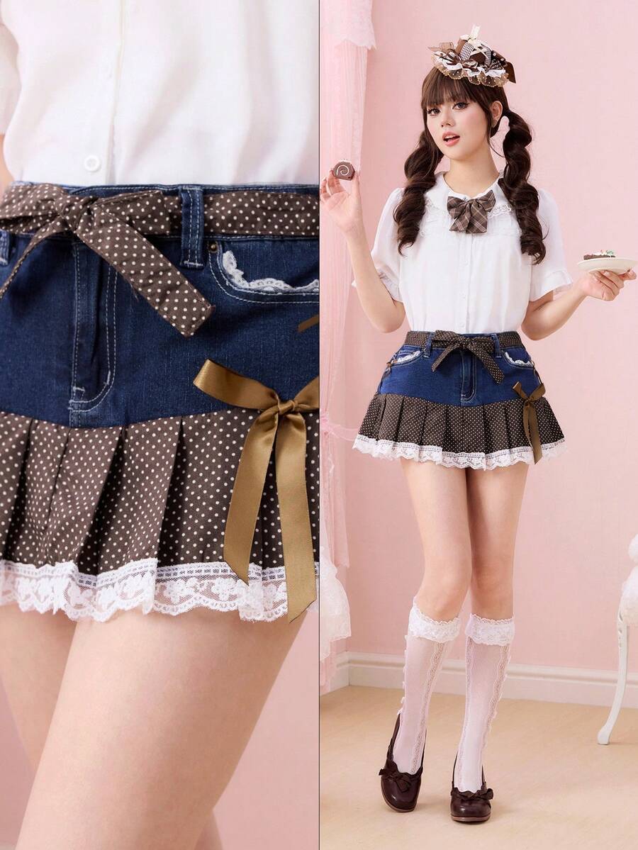 Kawaii تنورة جينز قصيرة مطوية مزينة بالدانتيل والحزام مع نقشة نقاط متباينة للنساء