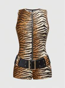 جمبسوت نسائية جينز ضيقة مطبوعة بنمر بطراز رجعي من الألفية الثانية