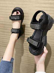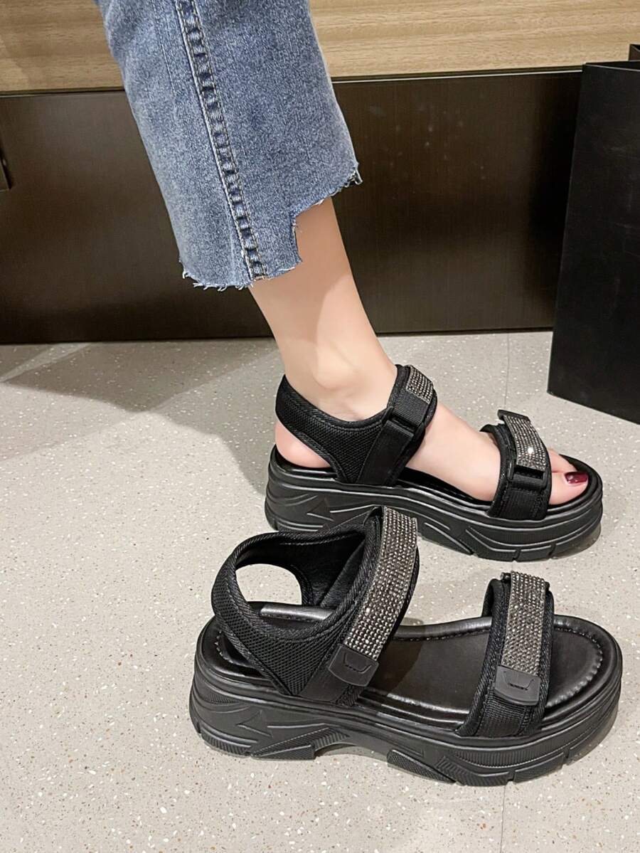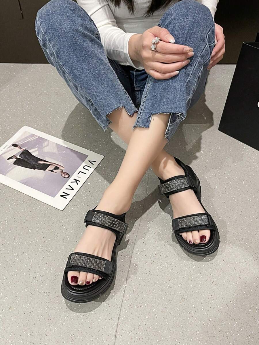 صنادل رياضية للنساء مرصعة بالراين 2024 جديدة صيفية أحذية شاطئ رومانية سفلية سميكة بقعدة ناعمة