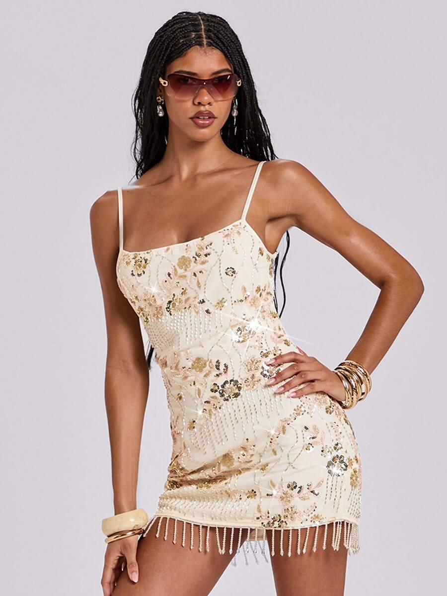 فستان صيفي قصير للنساء بحمالات رفيعة وظهر مكشوف مطرز بالخرز