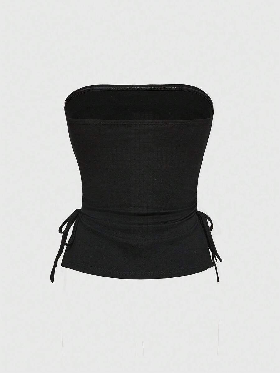 J-Fashion ملابس علوية نسائي قصير بدون أكتاف مزين بالرينستون والصليب على خلفية سوداء، مع سحاب وشق في الذيل