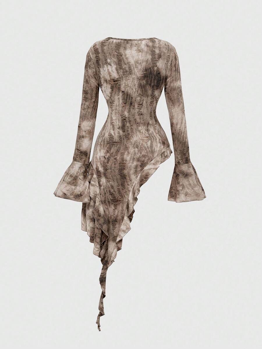 Grunge Punk ملابس علوية نسائية طويلة الأكمام مع تصميم متموج غير متماثل مطبوع بطريقة الصباغة المتداخلة بطراز Y2K
