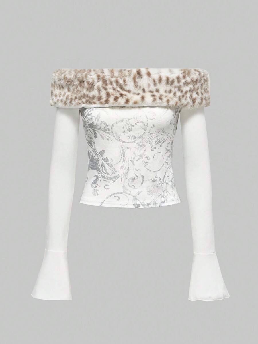 J-Fashion تي شيرت نسائي مطبوع عليه فرو بتصميم مرقع من Y2K، خريف/شتاء