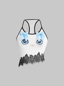 ملابس علوية أكمام بدون أكمام للنساء بطبعة قطة كيوت خجولة بفيونكة بتصميم ياباني من طراز Y2K