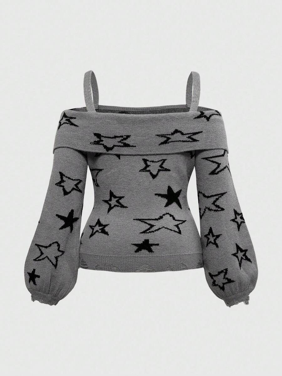 Grunge Punk كنزة صوفية نسائية كبيرة الحجم بنمط نجمي على الكتف مفتوحة بطراز بانك Y2K الرجعي