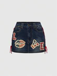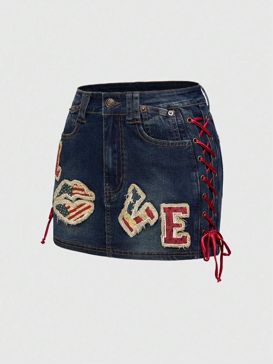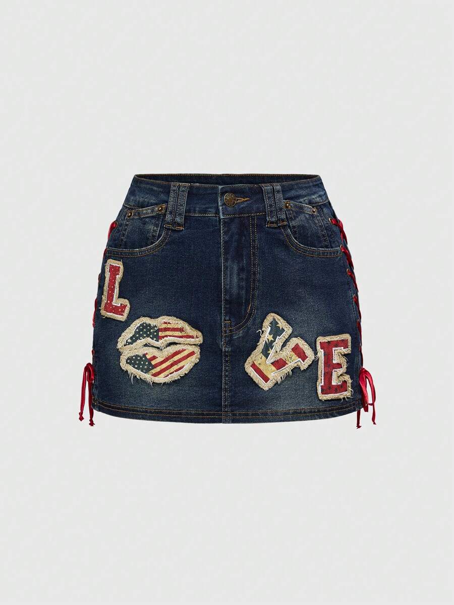 ROMWE Avant تنورة جينز منخفضة الخصر مطرزة بشعار "الحب" و علم الولايات المتحدة بطراز Y2K الرجعي الأمريكي