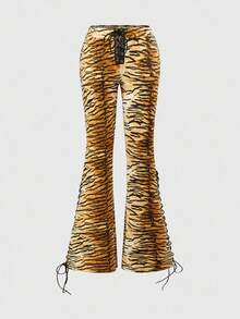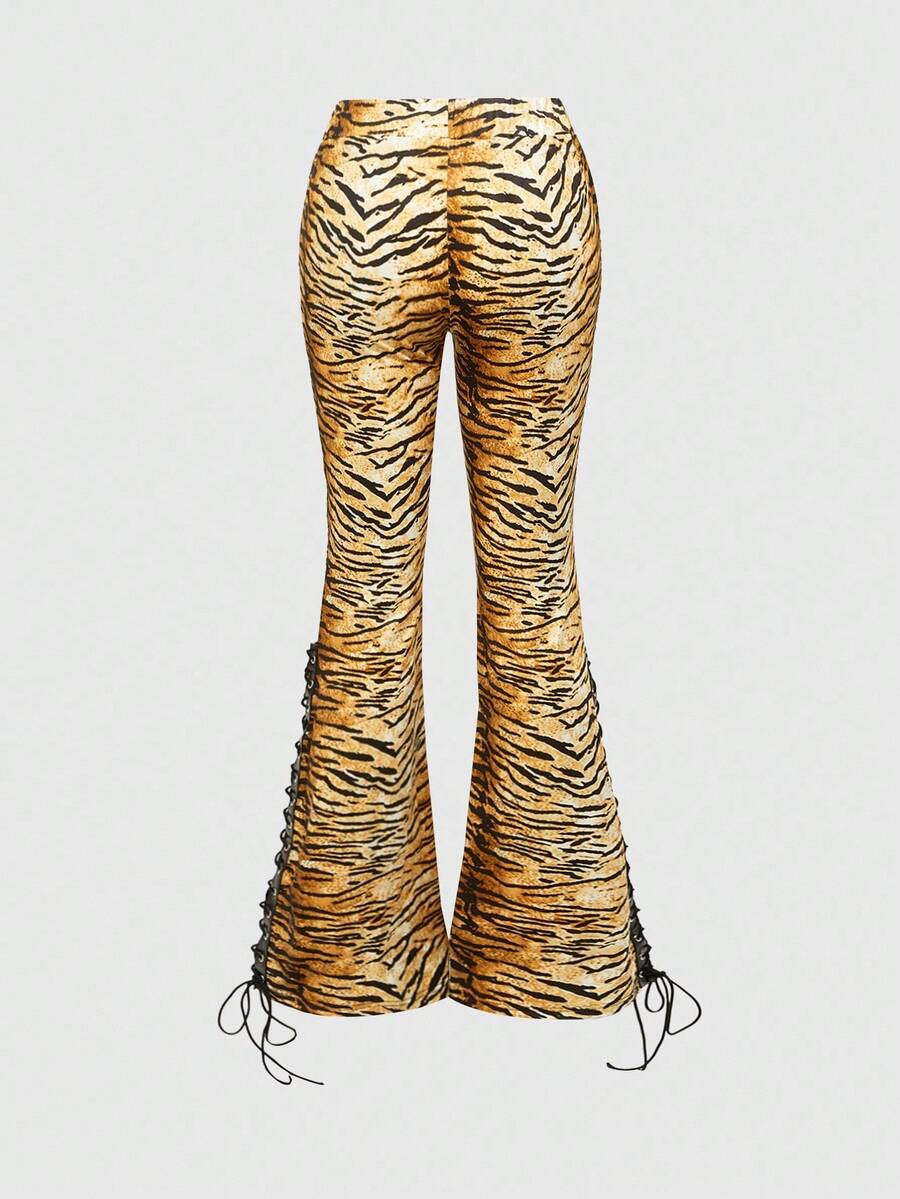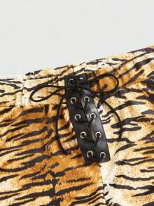 Grunge Punk بنطلون نسائي منخفض الخصر مزين بطبعة نمر وأربطة من جلد البولي يوريثان بطراز Y2K جذاب