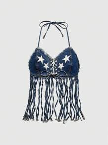 قميص جينز مطرز بنجوم نقرية فضية للنساء