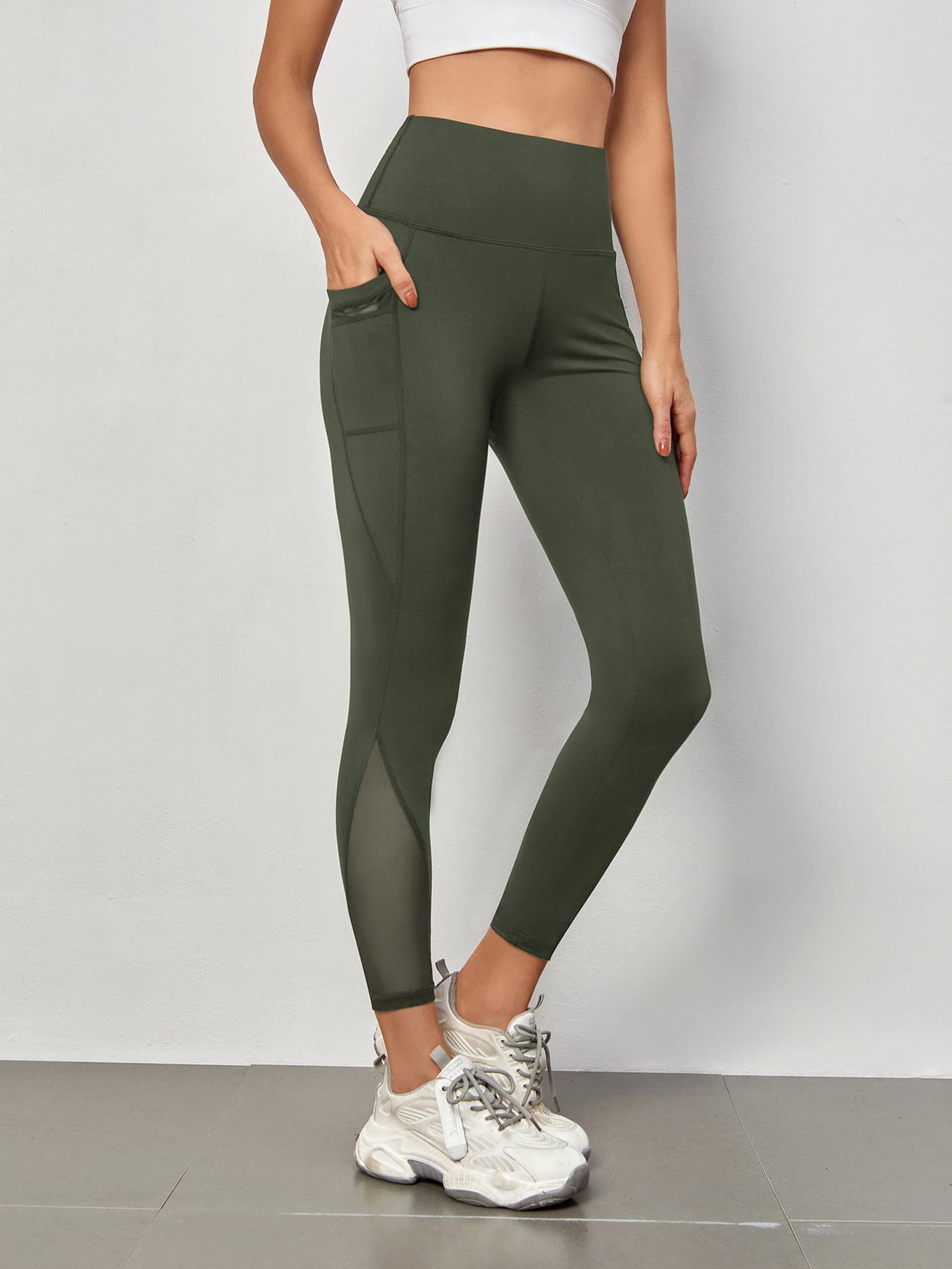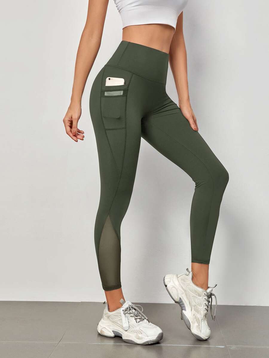 بنطلون يوجا ليجنز رياضي للتحكم في البطن بشبكة متباينة وحزام عريض مع جيب للهاتف