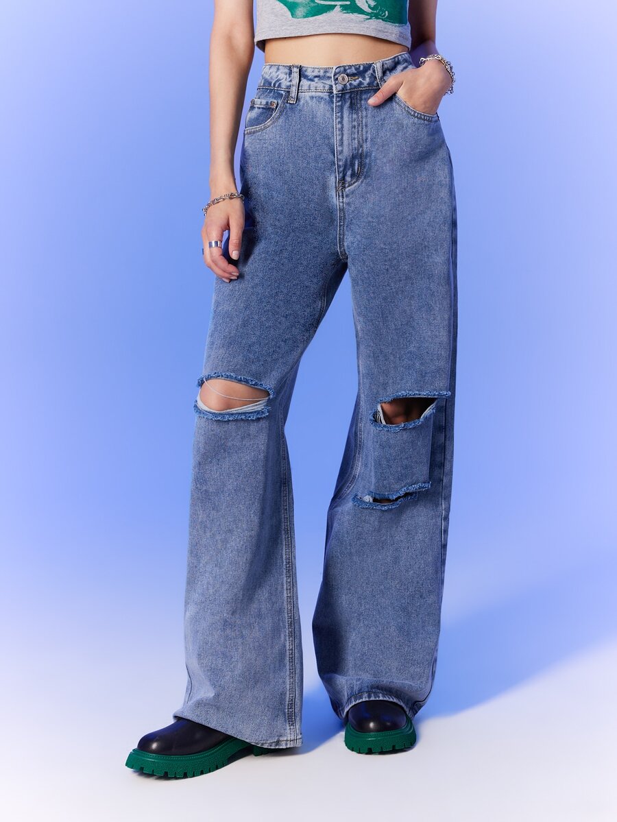 بنطلون جينز بساق واسع ممزق وبسستة
