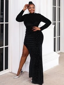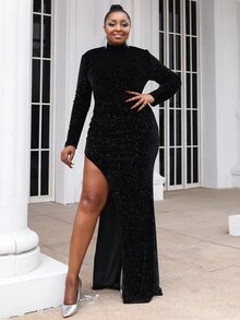 seomiscky فستان براق مخملي وبفتحة للفخذ بسستة طائر مقاس كبير