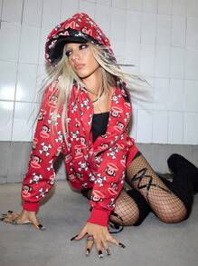 Paul Frank X ROMWE معطف هودي كبير الحجم مطبوع بألوان متباينة مع أذنين جميلة للنساء